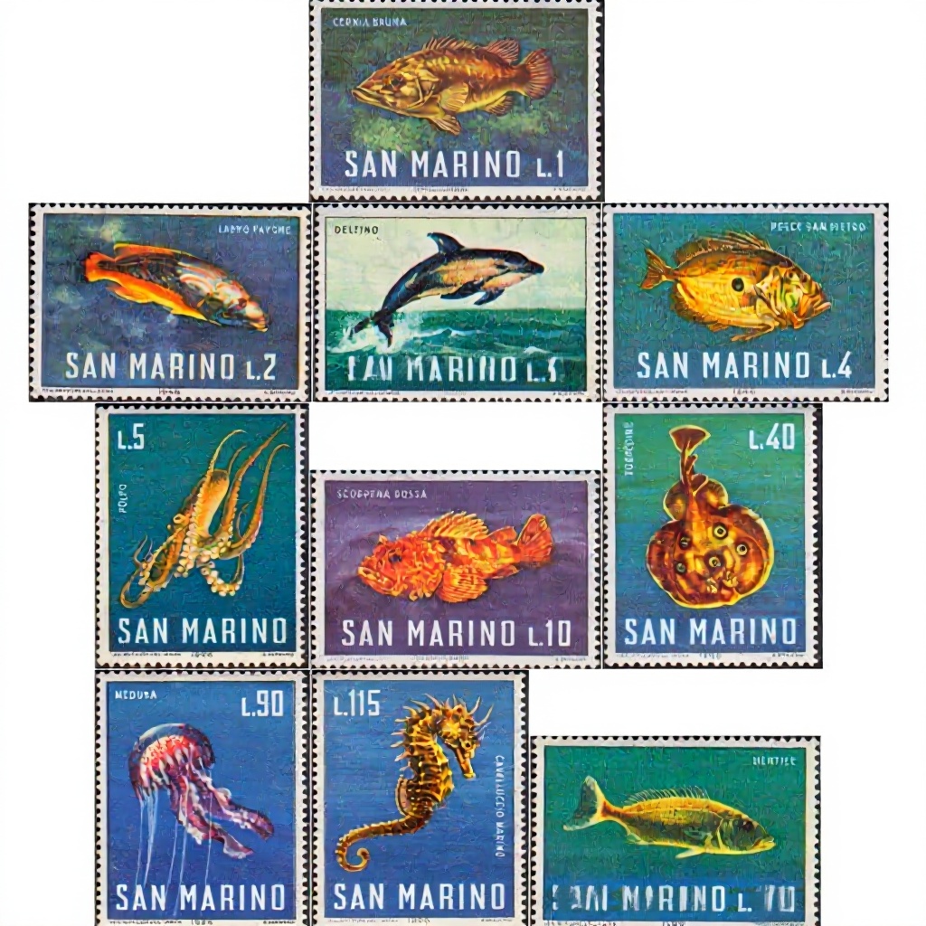 Cette collection complète de timbres Prophila, édition san Marin 869-878, présente des timbres neufs avec gomme originale, émis en 1966 et illustrant la faune marine. Chaque timbre est soigneusement préservé, garantissant une qualité supérieure et une authenticité, idéale pour les amateurs de philatélie.